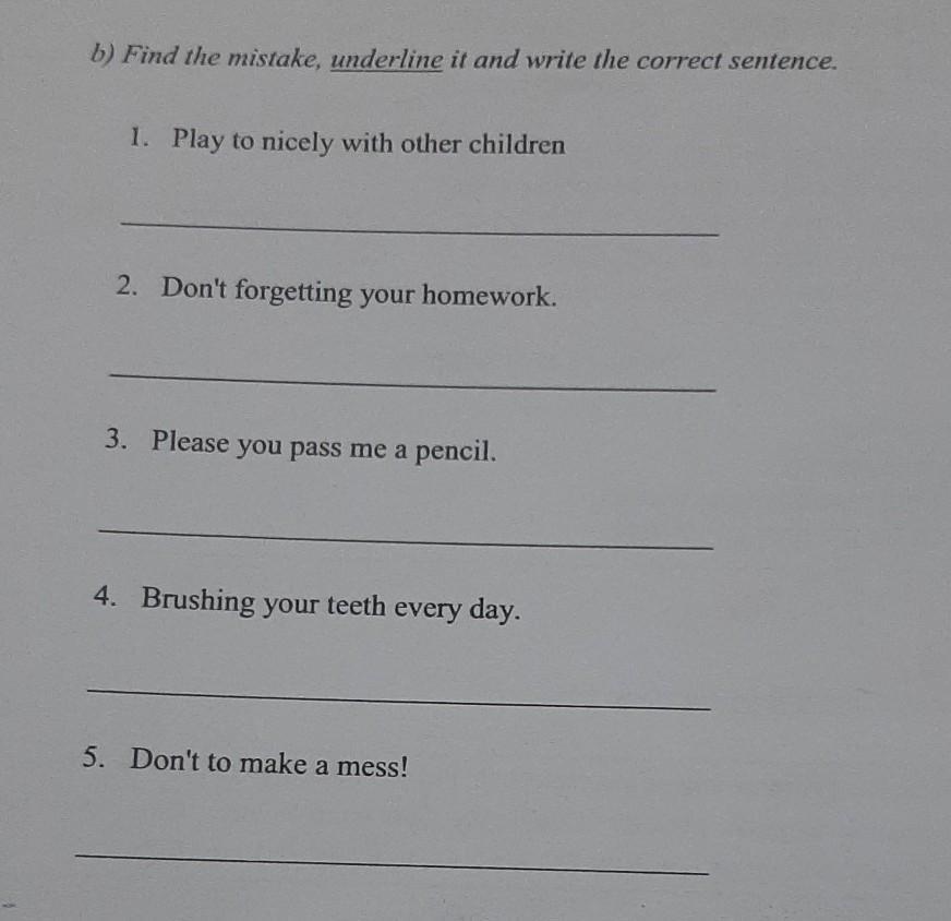 b) Find the mistake, underline it and write the correct sentence. 1. Play to nicely with other children 2. Don't forgetting your homework. 3. Please you pass me a pencil. 4. Brushing your teeth every day. 5. Don't to make a mess! a