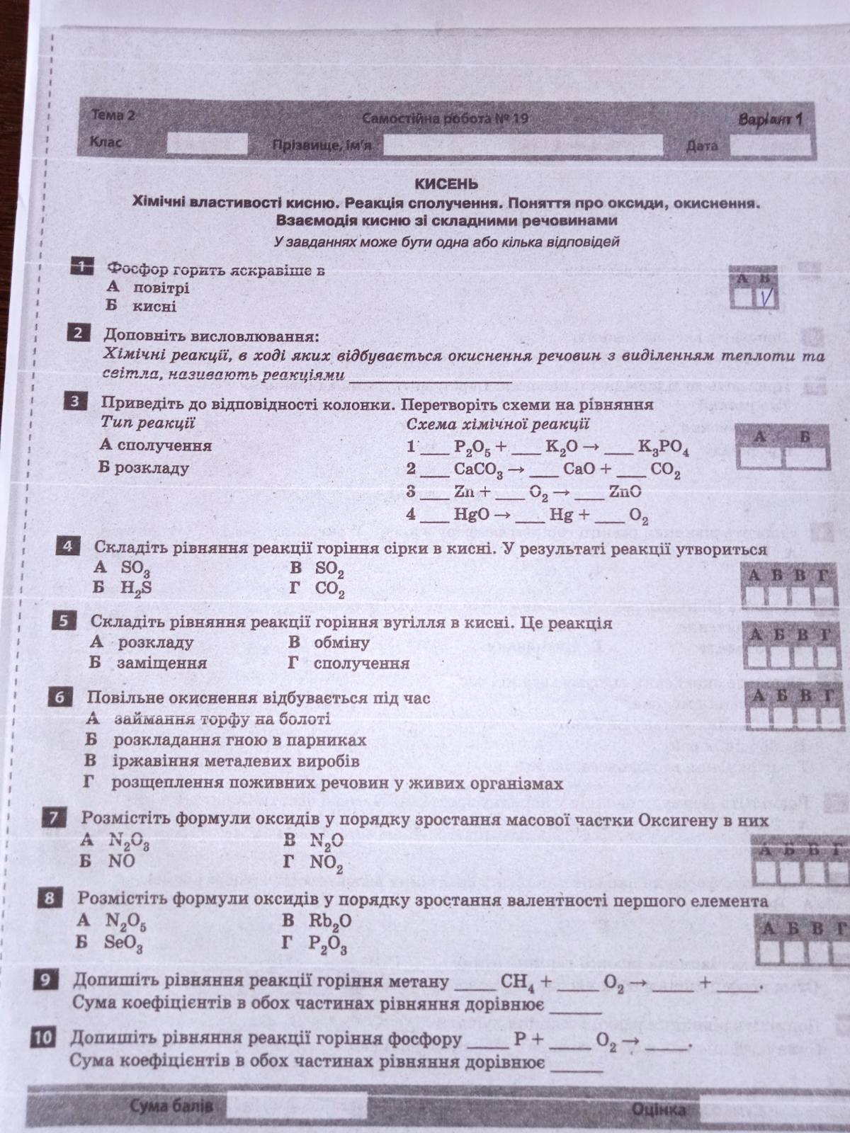 5)Г; 6)В, вроді; 7)1)Г;2)В;3)Б;4)А; вроді; 8)1)В;2)Г;3)А;4)Б; 9) CH4 + O2 = CO2 + 2H2; 5; 10) 4P + 5O2 = 2P2O5; 11;