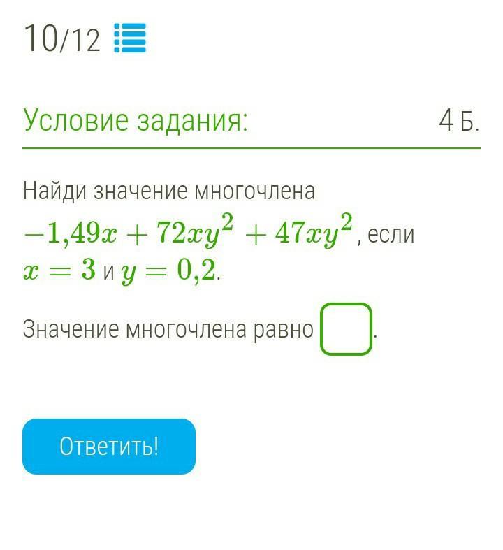 -1,49х+72ху²+47ху²=-1,49х+119ху²=-1,49×3+119×3×0,2²=-4,47+14,28=9,81