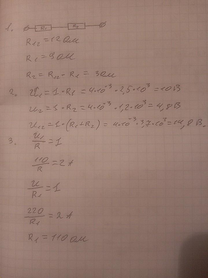 2.Участок электрической цепи, по которому проходит ток силой I=4 мА, состоит из двух последовательно соединенных резисторов, сопротивление которых R1=2.5 КОМ И R2=1.2 ком. Определите напряжение на всем участке и на отдельных резисторах.