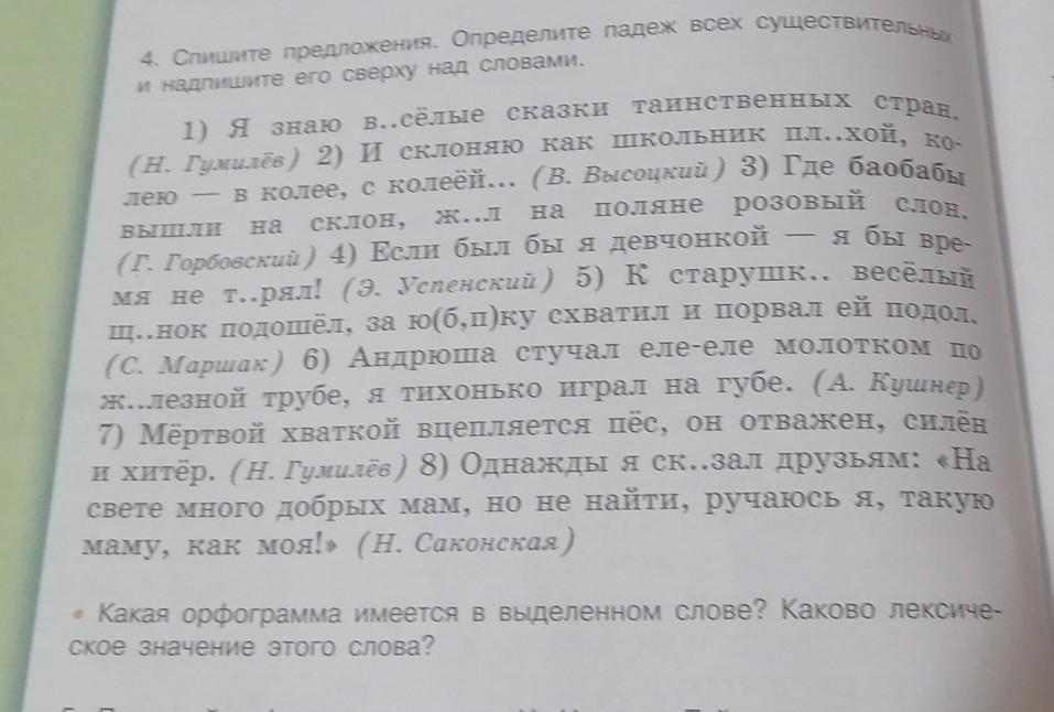 Ответ: 1) Я знаю весёлые сказки (в.п.) таинственных стран (р.п.) 2) И склоняю как школьник(и.п.) плохой, колею (в.п.) - в колее (п.п.), с колеёй (т.п.) 3) Где баобабы (и.п.) вышли на склон (в.п.), жил на поляне (п.п.) розовый слон (и.п.) 4) Если был бы я девчонкой (т.п.) - я бы время (в.п.) не терял! 5) К старушке (д.п.) весёлый щенок (и.п.) подошёл, за юбку (в.п.) схватил и порвал ей подол (в.п.) 6) Андрюша (и.п.) стучал еле-еле молотком (т.п.) по железной трубе (д.п.), я тихонько играл на губе (п.п.). 7) Мёртвой хваткой (т.п.) вцепляется пёс (и.п.), он отважен, силён и хитёр. 8) Однажды я сказал друзьям (д.п.): «На свете (п.п.) много добрых мам (р.п.), но не найти, ручаюсь я, такую маму (в.п.), как моя!»