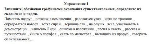 Помогать подругЕ (Д.п., 1 скл.), потолок[ ] (И.п./В.п., 2 скл.) в помещениИ (П.п., 2 скл.), радоваться удачЕ (Д.п., 1 скл.), идти по тропинкЕ (Д.п., 1 скл.), обрадоваться новостИ (Д.п., 3 скл.), веткА (И.п., 1 скл.) сиренИ (Р.п., 3 скл.), вершинА (И.п., 1 скл.) ёлкИ (Р.п., 1 скл.), на опушкЕ (П.п., 1 скл.) лесА (Р.п., 2 скл.), участвовать в демонстрациИ (П.п., 1 скл.), написать ЛидиИ (Д.п., 1 скл.), ошибкИ (И.п./В.п., ошибка - 1 скл.) в изложениИ (П.п., 2 скл.), песнЯ (И.п., 1 скл.) о счастьЕ (П.п., 2 скл.), рассказ[ ] (И.п./В.п., 2 скл.) о путешествиИ (П.п., 2 скл.), книгА (И.п., 1 скл.) в портфелЕ (П.п., 2 скл.), ехать по магистралИ (Д.п., 3 скл.), вытащить из прорубИ (Р.п., 3 скл.), говорить об успеваемостИ (П.п., 3 скл.).