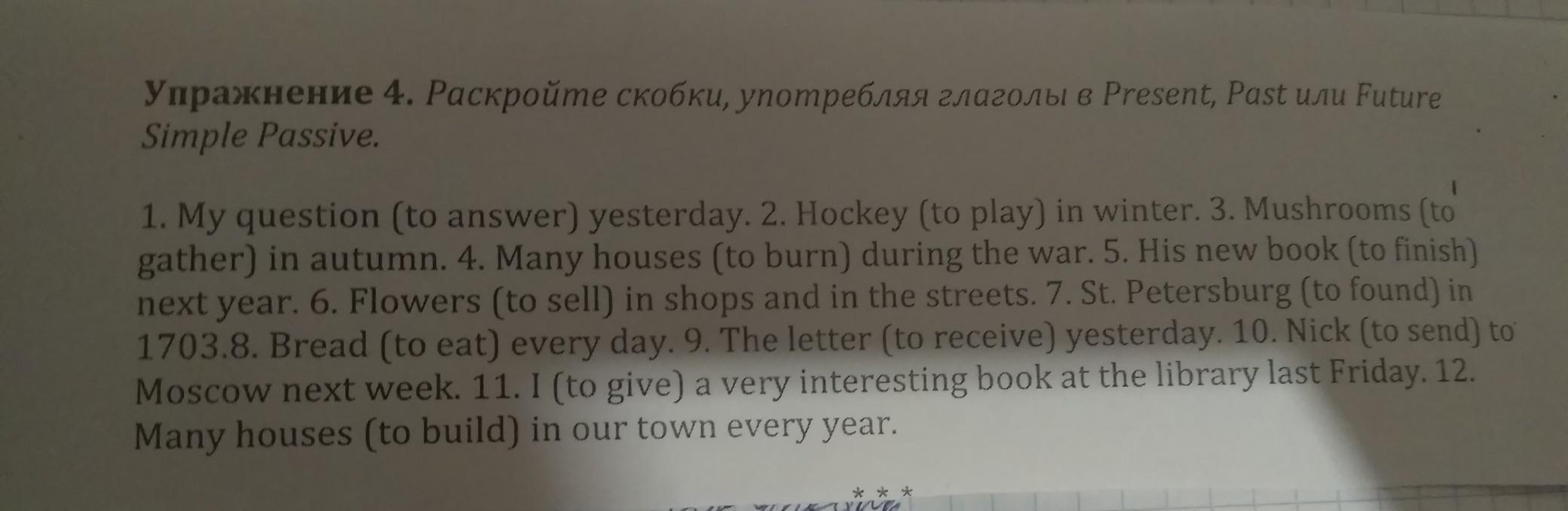 Упражнение 4. Раскройте скобки, употребляя глаголы в Present, Past или Future Simple Passive.