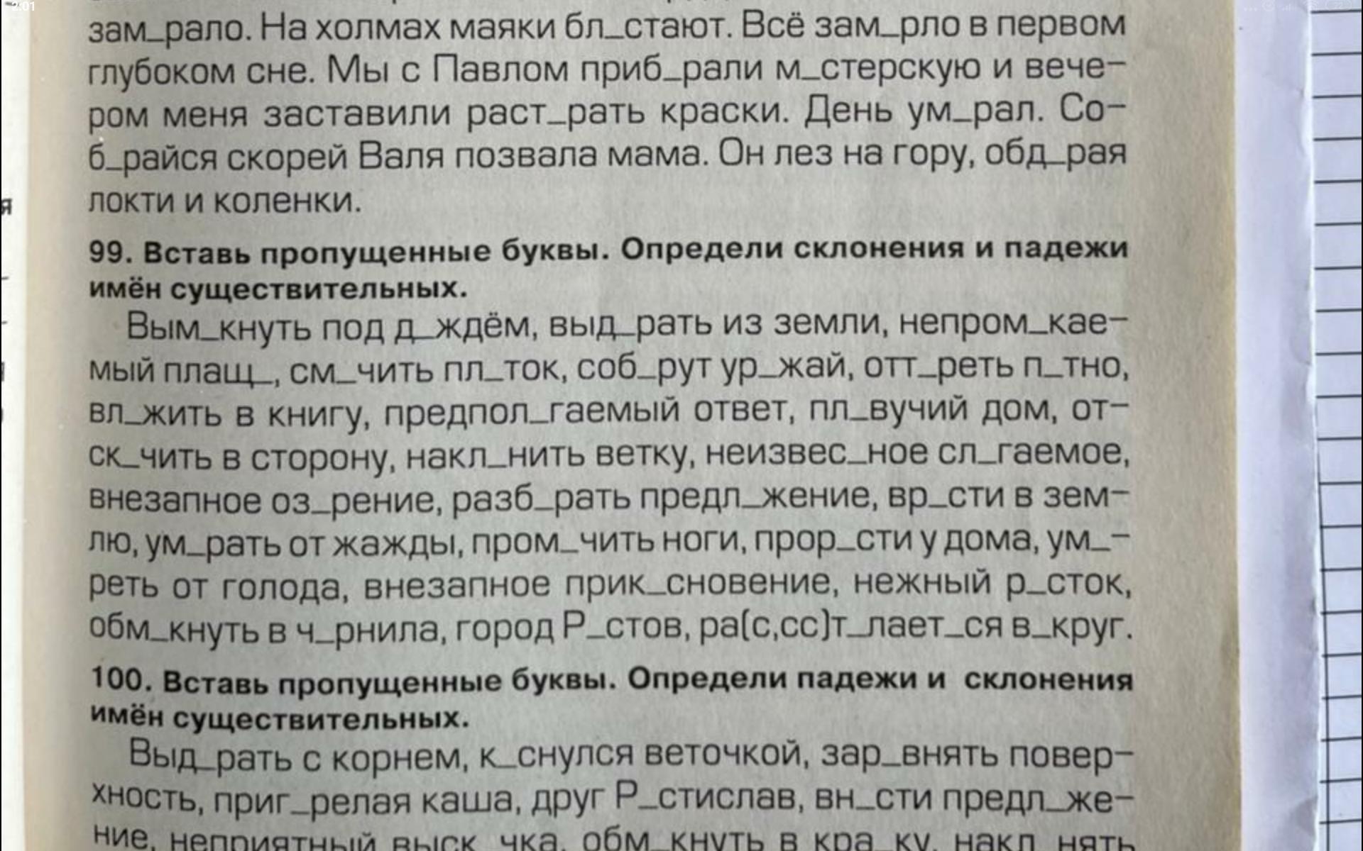 Вымокнуть под дождём (Т.п., 2 скл.), выдирать из земли (Р.п., 1 скл.), непромокаемый плащ (И.п./В.п. - в контексте, 2 скл.), смочить платок (В.п., 2 скл.), соберут урожай (В.п., 2 скл.), оттереть пятно (В.п., 2 скл.), вложить в книгу (В.п., 1 скл.), предполагаемый ответ (И.п./В.п. - в контексте, 2 скл.), плавучий дом (И.п./В.п. - в контексте, 2 скл.), отскочить в сторону (В.п., 1 скл.), наклонить ветку (В.п., 1 скл.), неизвестное слагаемое (И.п./В.п. - в контексте, 2 скл.), внезапное озарение (И.п./В.п. - в контексте, 2 скл.), разбирать предложение (В.п., 2 скл.), врасти в землю (В.п., 1 скл.), умирать от жажды (Р.п., 1 скл.), промочить ноги (В.п. нога - 1 скл.), прорасти у дома (Р.п., 2 скл.), умереть от голода (Р.п., 2 скл.), внезапное прикосновение (И.п./В.п. - в контексте, 2 скл.), нежный росток (И.п./В.п. - в контексте, 2 скл.), обмакнуть в чернила (В.п., скл. не имеет), город (И.п./В.п. - контексте, 2 скл.) Ростов (И.п./В.п. - в контексте, 2 скл.), расстилается вокруг (наречие).