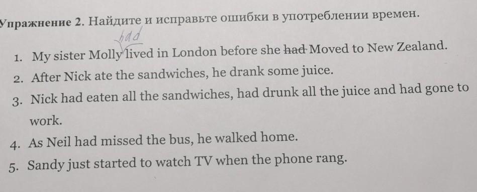 1. Моя сестра Молли жила в Лондоне до того, как переехала в Новую Зеландию. 2. После того, как Ник съел бутерброды, он выпил немного сока. 3. Ник съел все бутерброды, выпил весь сок и ушел на работу. 4. Поскольку Нил опоздал на автобус, он пошел домой пешком. - Сэнди начала смотреть телевизор, когда зазвонил телефон.