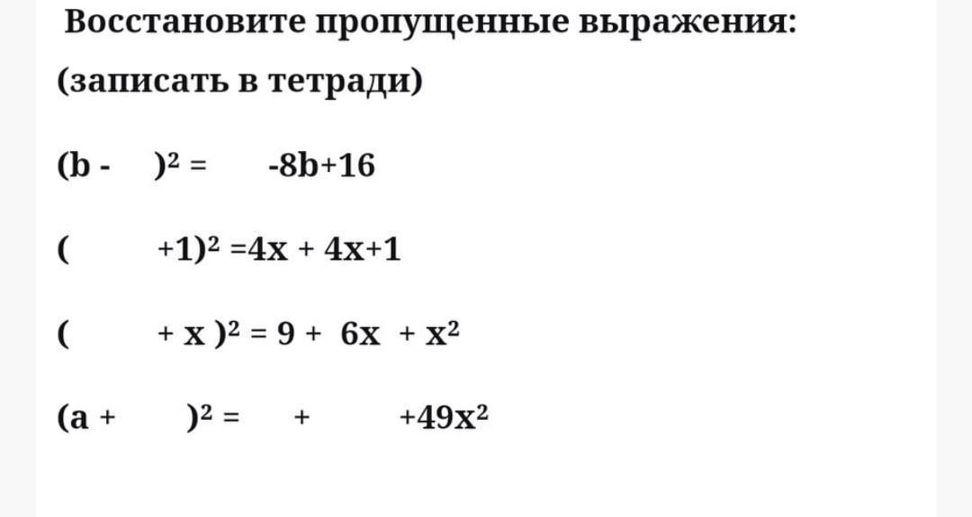 (b-4)^2 = b^2-8b+16\\(2x+1)^2 = 4x^2+4x+1\\(3 + x)^2 = 9 + x + x^2\\(a+7x)^2 = a^2+14x+49x^2