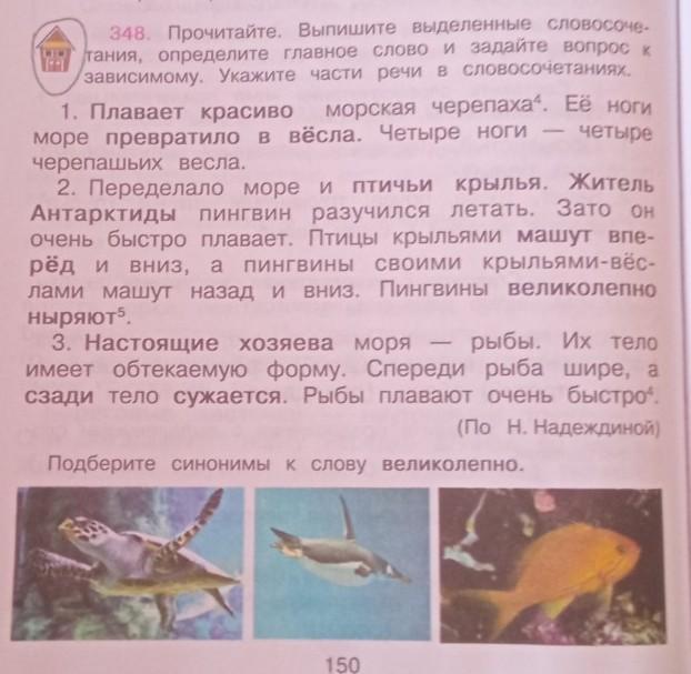 348. Прочитайте. Выпишите выделенные словосоче- тания, определите главное слово и задайте вопрос к зависимому. Укажите части речи в словосочетаниях.