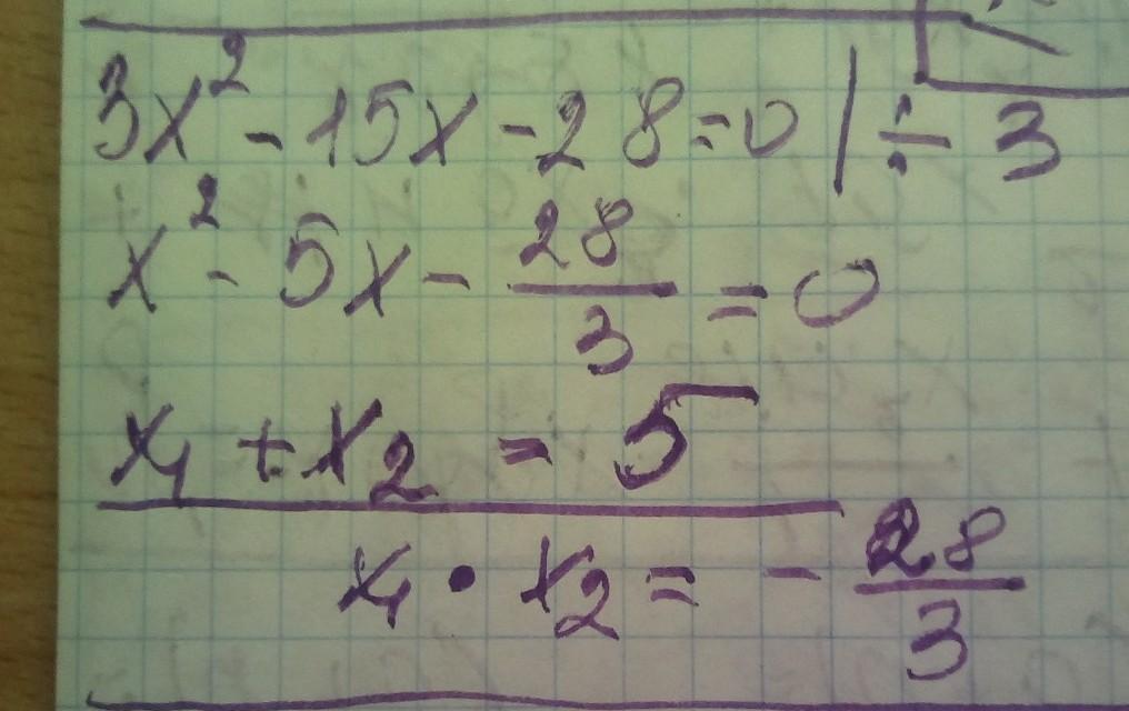 Разделим уравнение на коэффициент 3, получим равносильное уравнение: х²-5х- 9 1/3(это приведенное квадратное уравнение)