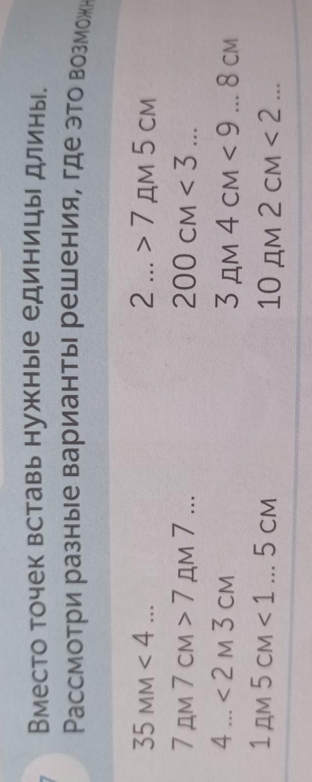 РАБОТА В ГРУППЕ 7 Вместо точек вставь нужные единицы длины. Рассмотри разные варианты решения, где это возможно. 35 мм (4 ... 7 дм 7 см >7 дм 7 ... 4 ... 7 дм 5 см 200 см