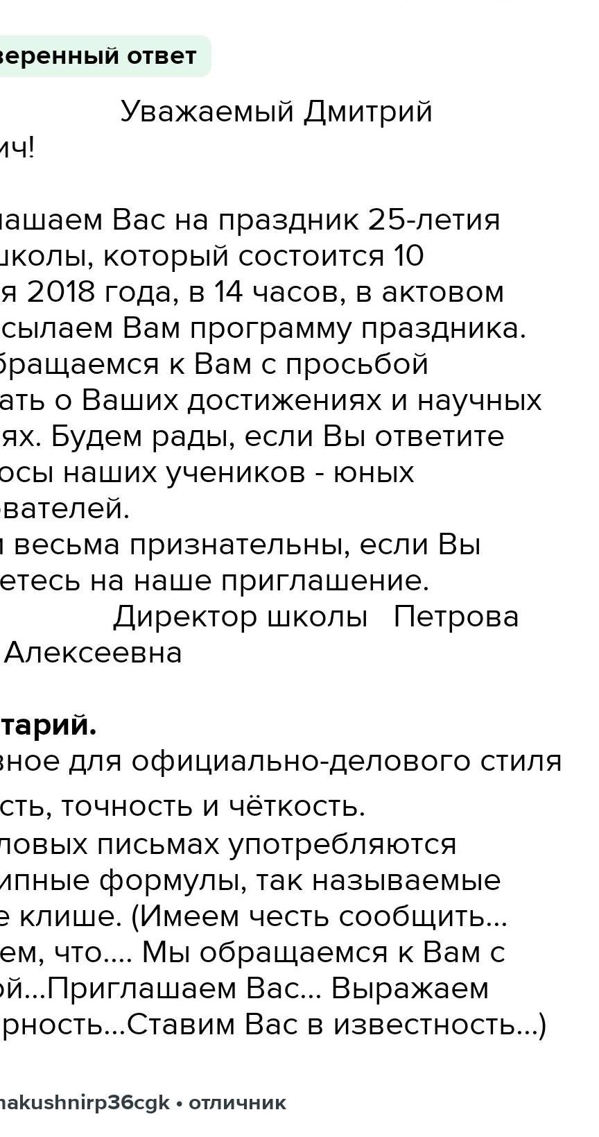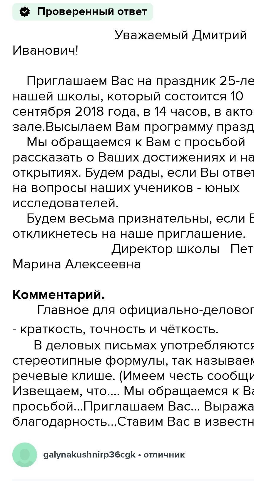 Составте текс,в котором (по выбору) содержитца ;1)обращение к официальному лицу или почётному гостю с приглашением на школьный праздник 2)деловое предложение о сотрудничестве.Тему праздника при программе сотруднечества определите самостоятельно.Используя обращение,сотвествующее речевой ситуации.Подумайте,какими словами следует завершить деловой текст .чтобы сохранить официально-деловое стиль.