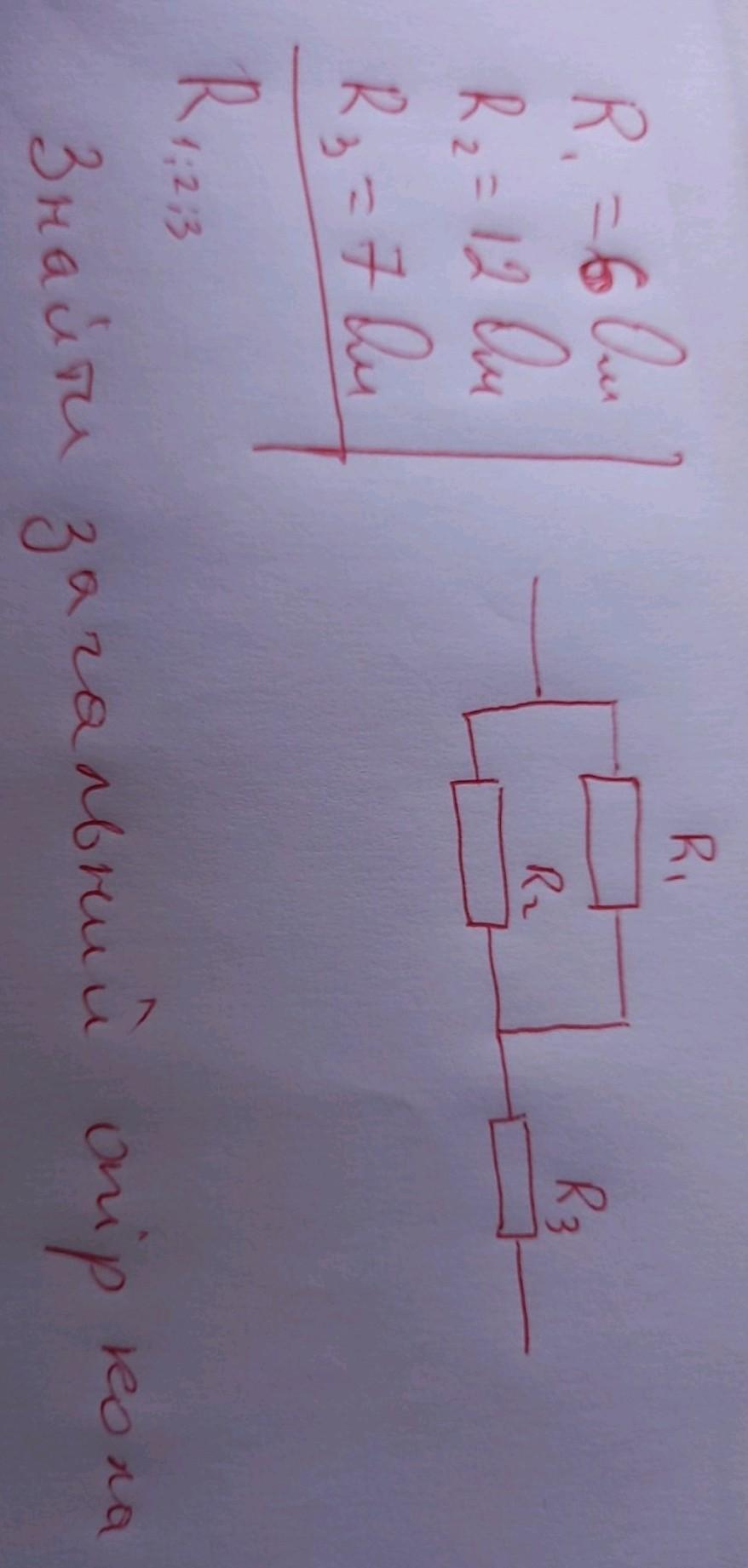 Резисторы R₁ и R₂ соединены параллельно, а резистор R₃ присоединён к ним последовательно, поэтому общее сопротивление