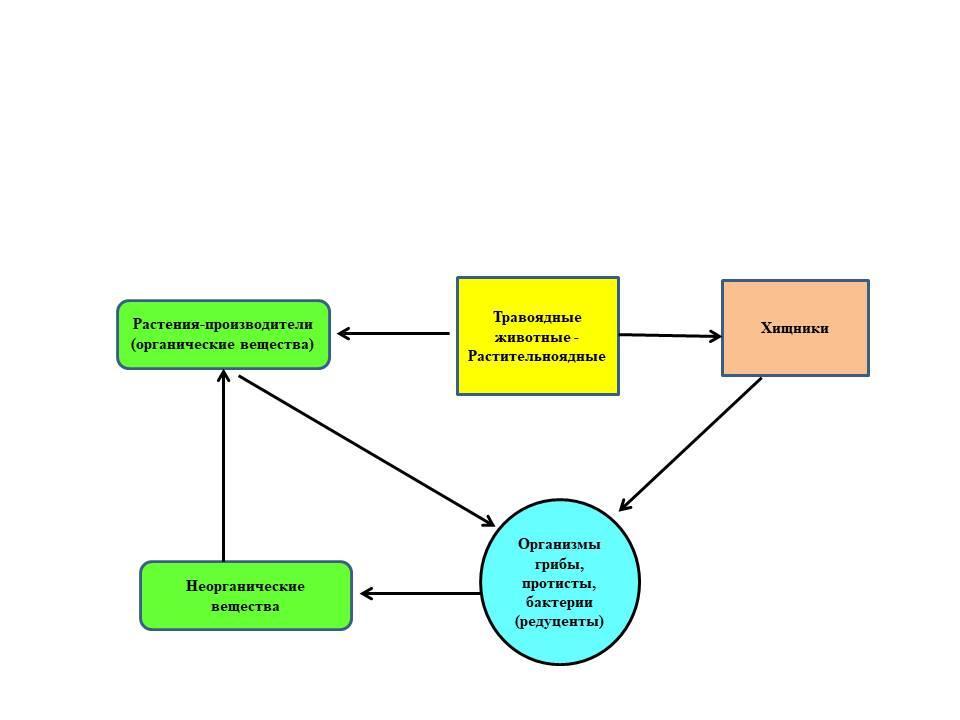 звеньях пищевой цепи органические вещества отмерших организмов, их частей (листья, ветки, корни растений или выделения живых организмов) служат пищей для грибов, многих протистов и бактерий. Грибы, протесты и бактерии превращают органические вещества в неорганические. Так пополняется запас неорганических веществ в почве и воде. Неорганические вещества затем снова используются растениями. Таким образом, в природе осуществляется