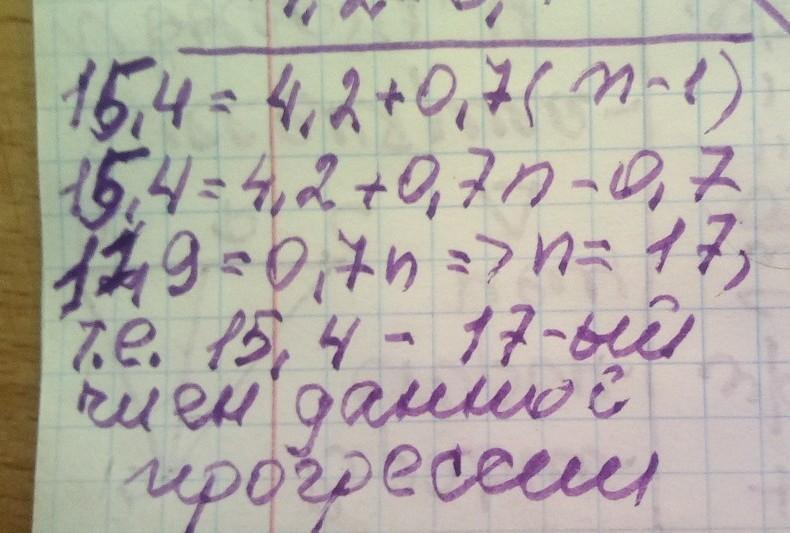 знайдіть номер члена арифметичної прогресії 4,2 4,9 5,6 6,3 який дорівнює 15,4