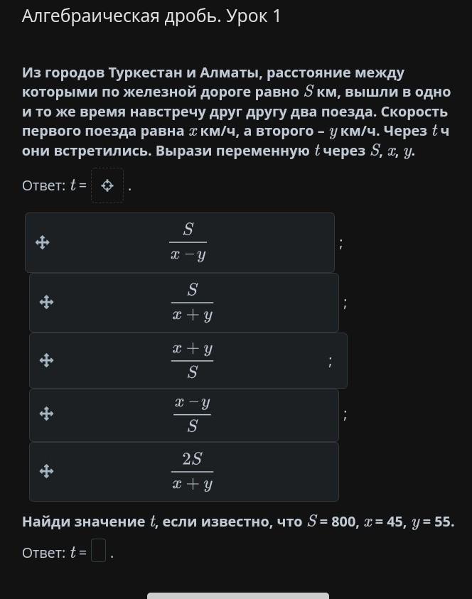 Из городов Туркестан и Алматы, расстояние между которыми по железной дороге равно overline 5 KM вышли в одно и то же время навстречу друг другу два поезда. Скорость первого поезда равна х км /4, а второго - y KM/4. Ч.Чepe3 t ч они встретились. Вырази переменную t чepe3 S, x, у.