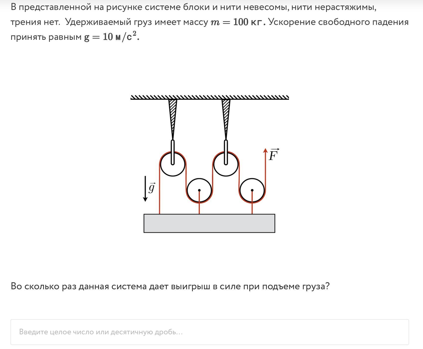 Поскольку у нас 2 подвижных блока (два других - не подвижные!), а каждый подвижный блок дает выигрыш в силе в два раза, то общий выигрыш равен n=4.