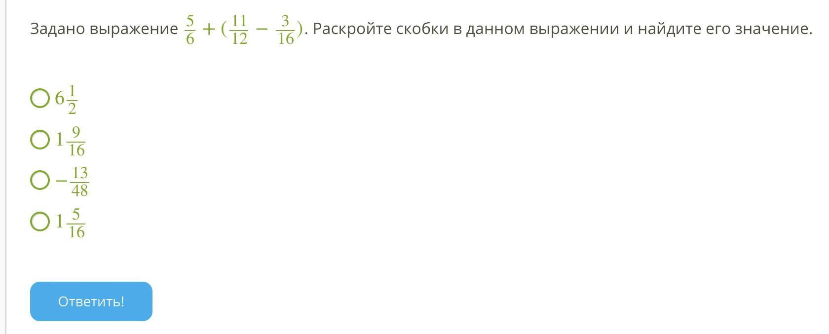 https://tex.z-dn.net/?f=%5Cfrac%7B5%7D%7B6%7D%20%2B%20(%20%5Cfrac%7B11%7D%7B12%7D%20-%20%5Cfrac%7B3%7D%7B16%7D%20)%20%3D%5Cfrac%7B10%7D%7B12%7D%2B%5Cfrac%7B11%7D%7B12%7D-%5Cfrac%7B3%7D%7B16%7D%20%3D%5Cfrac%7B10%2B11%7D%7B12%7D-%5Cfrac%7B3%7D%7B16%7D%20%3D%5Cfrac%7B21%7D%7B12%7D-%5Cfrac%7B3%7D%7B16%7D%20%3D%5Cfrac%7B7%7D%7B4%7D-%5Cfrac%7B3%7D%7B16%7D%20%3D%5Cfrac%7B28%7D%7B16%7D-%5Cfrac%7B3%7D%7B16%7D%20%3D%5Cfrac%7B28-3%7D%7B16%7D%20%3D%5Cfrac%7B25%7D%7B16%7D%20%3D%201%5Cfrac%7B9%7D%7B16%7D