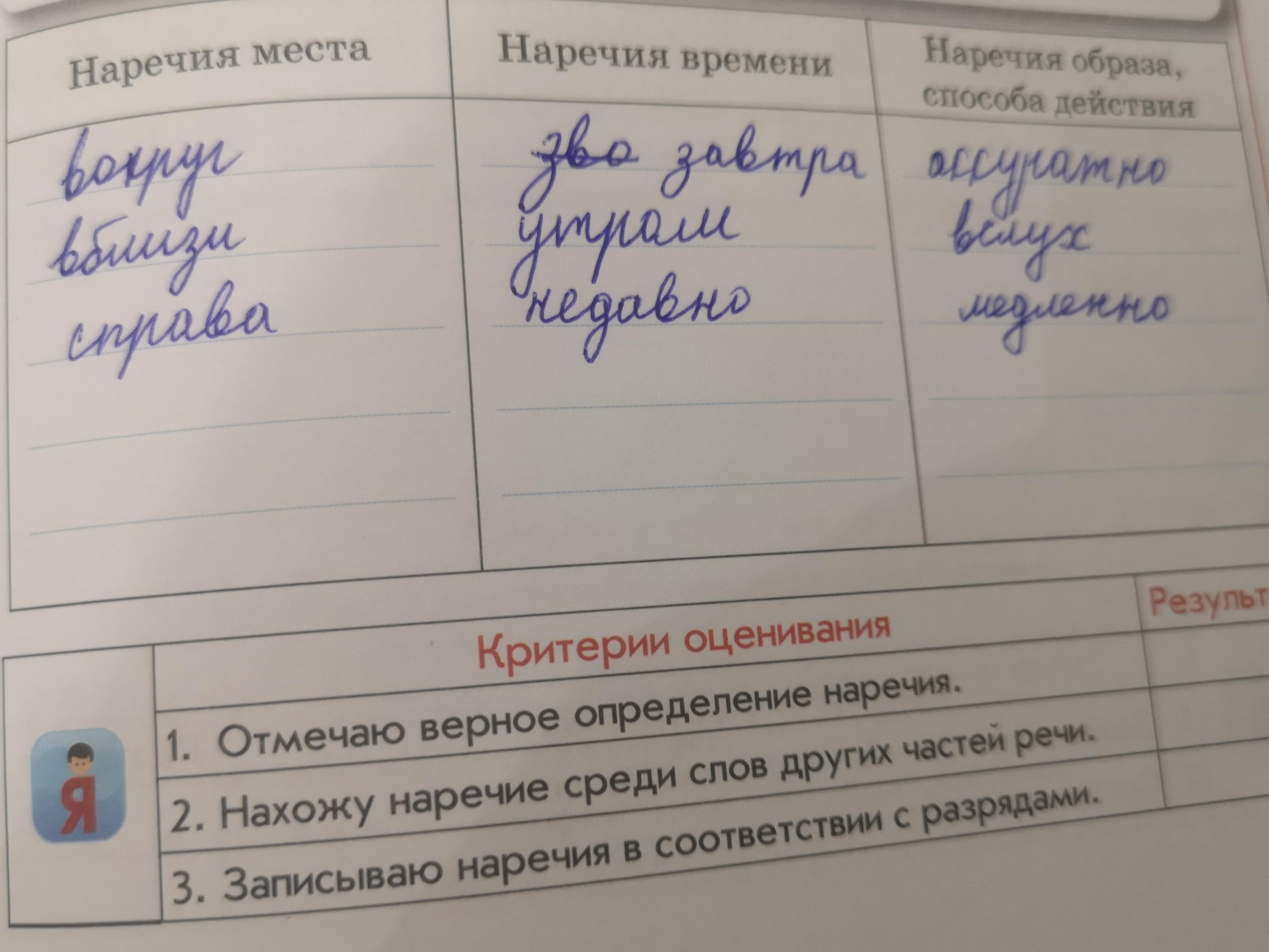 Анализируй! 3. Запиши наречия в соответствии с разрядами. Завтра, вокруг, вблизи, аккуратно, вслух, утром, справа, медленно, недавно. Наречия места Наречия времени Наречия образа, способа действия
