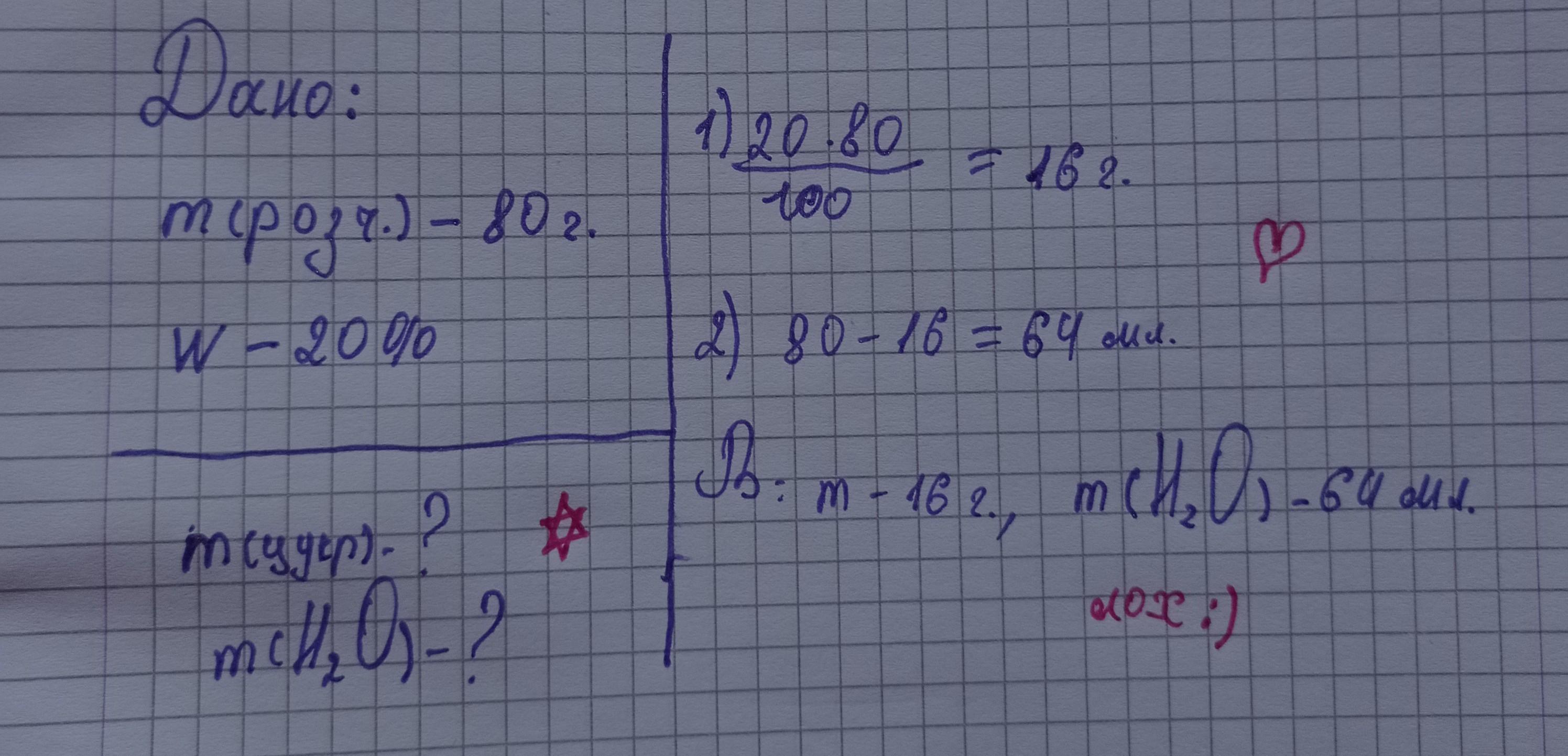 1) виготовити розчин цукру масою 80 г масовою часткою розчиненої речовини 20%