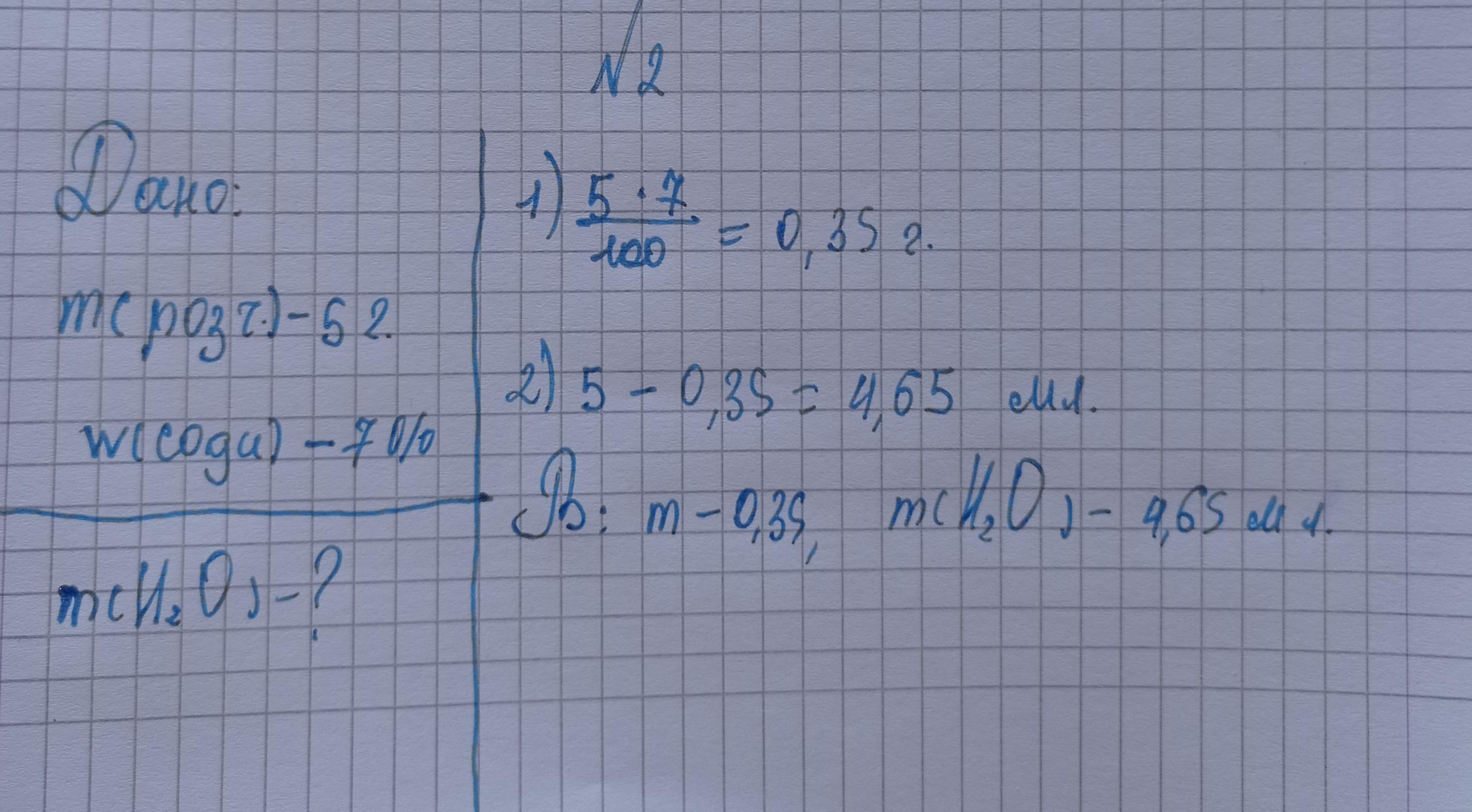 2) обчисліть масу води, необхідна для виготовлення розчину масою 5г масовою часткою харчової соди 7%
