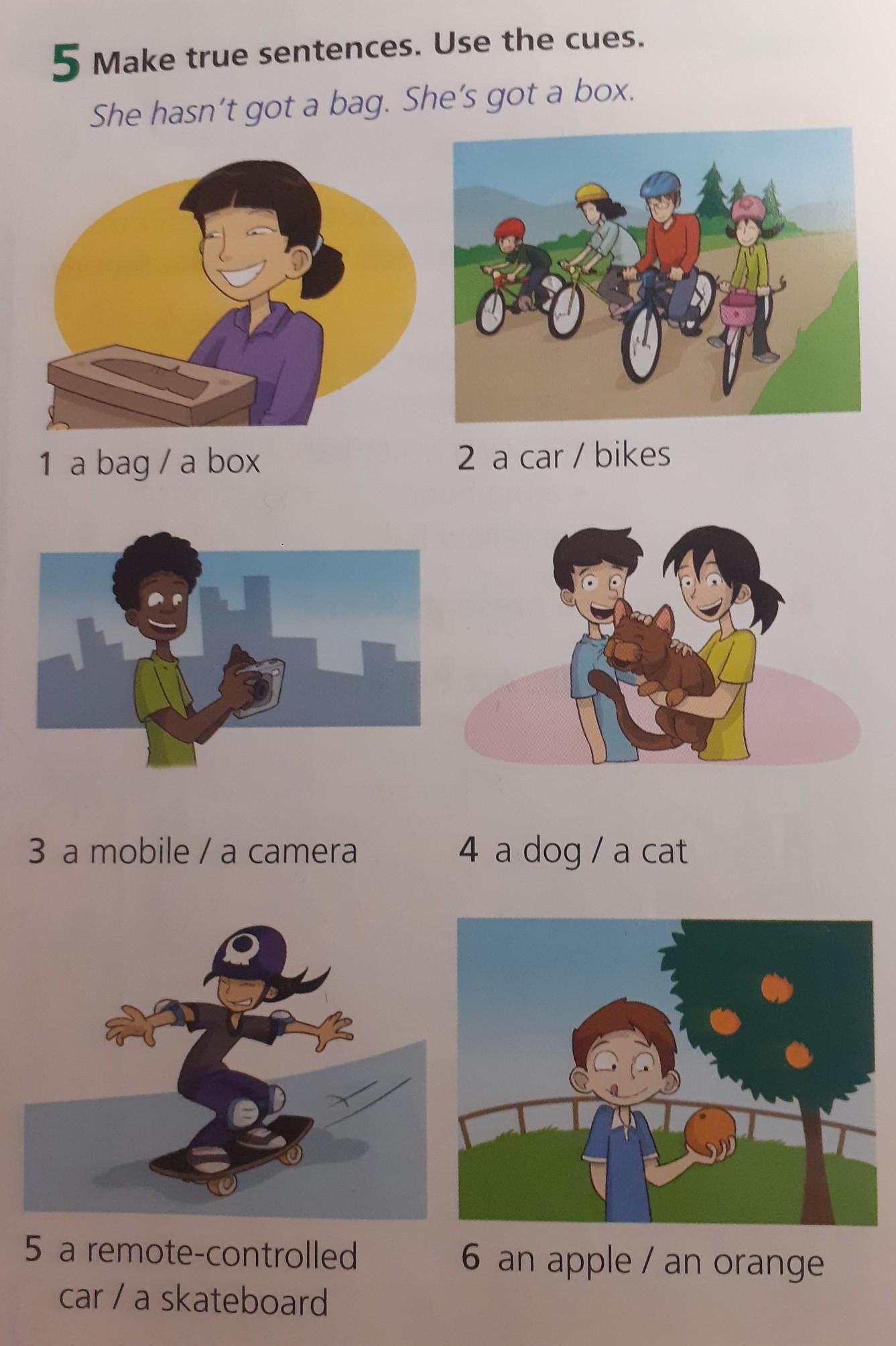 5 Make true sentences. Use the cues. She hasn't got a bag. She's got a box, 1 a bag / a box 2 a car / bikes 3 a mobile / a camera 4 a dog / a cat 6 an apple / an orange 5 a remote-controlled car / a skateboard