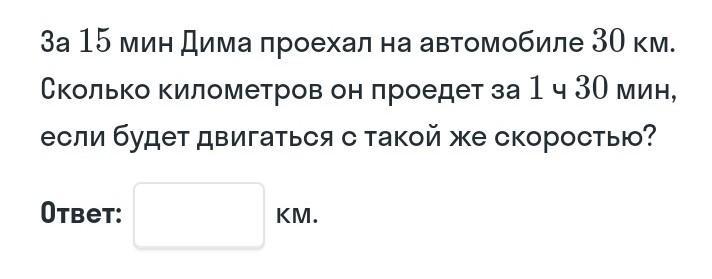 За 15 мин Дима проехал на автомобиле 30 км. Сколько километров он проедет за 1 ч 30 мин, если будет двигаться с такой же скоростью?