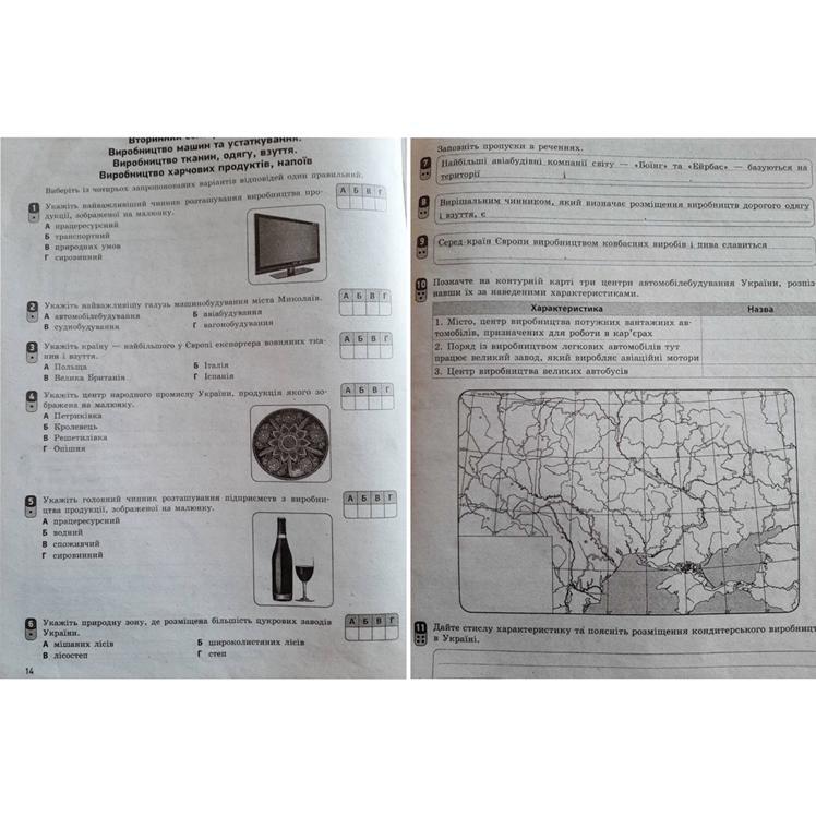 Контрольна робота з географії 9 клас. Вторинний сектор економіки. Виробництво машин та устаткування. Виробництво тканин, одягу. взуття. Виробництво харчових продуктів, напоїв. (Відповіді)