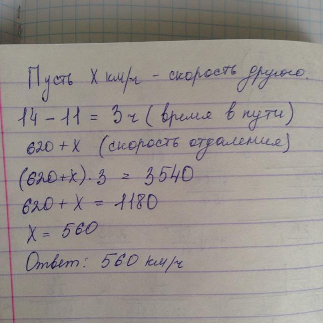 В 11:00 с аэродрома вылетели одновременно в противоположных направлениях два самолёта в 14:00 расстояние между ними было 3540 км один из них летел со скоростью 620 км ч С какой скоростью летел другой самолёт. И сделать проверку задачи.