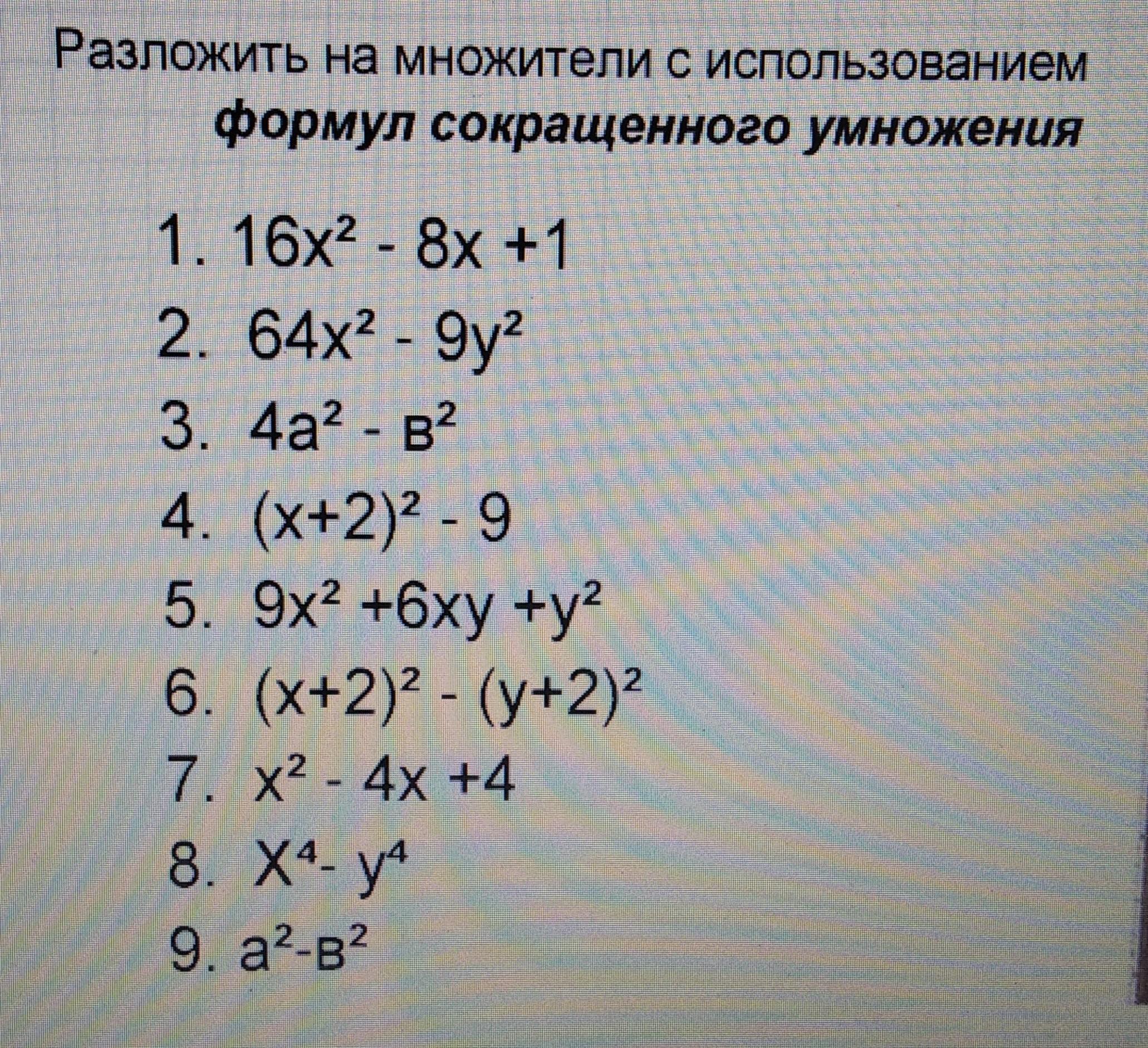 х⁴-у⁴=(х²-у²)(х²+у²)=(х-у)(х+у)(х²+у²)