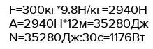 Определите мощность двигателя равномерно понимающего лифта массой 300 кг на высоту 12 м за 30 секунд