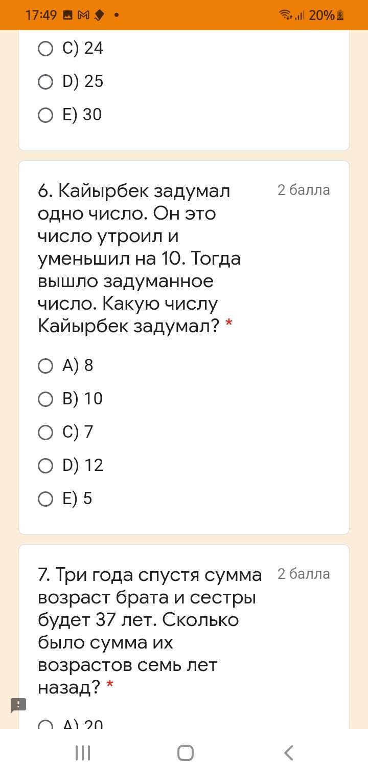 . Кайырбек задумал одно число. Он это число утроил и уменьшил на 10. Тогда вышло задуманное число. Какую числу Кайырбек задумал? *