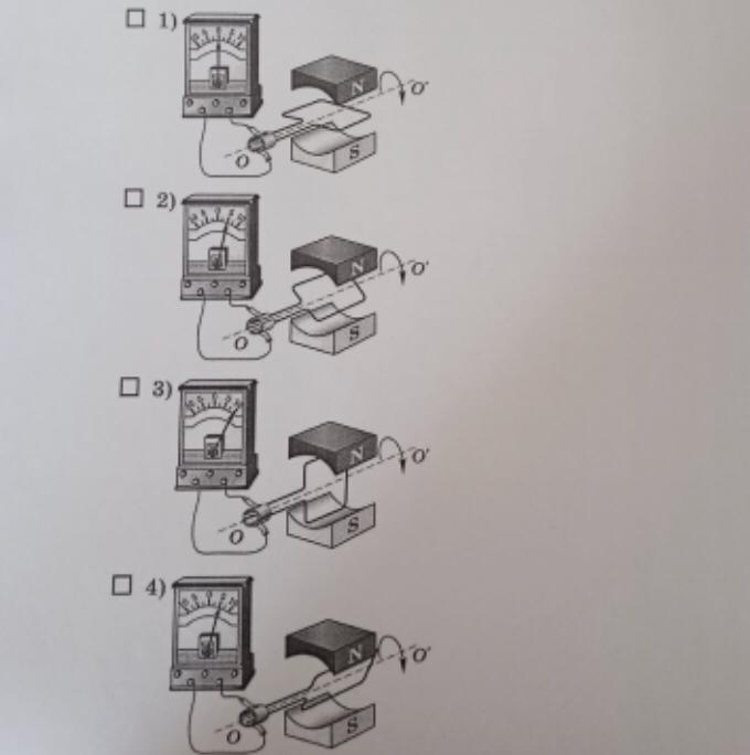 Рамка, помещённая в однородное магнитное поле, вращается относительно оси ОО'. На рисунках показаны положения рамки в различные моменты времени. Поток вектора магнитной индукции максимален, когда рамка находится в положении