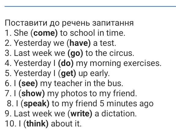 Поставити до речень запитання 1. She (come) to school in time. 2. Yesterday we (have) a test. 3. Last week we (go) to the circus. 4. Yesterday I (do) my morning exercises. 5. Yesterday I (get) up early. 6. I (see) my teacher in the bus. 7.1 (show) my photos to my friend. 8. I (speak) to my friend 5 minutes ago 9. Last week we (write) a dictation. 10. I (think) about it.
