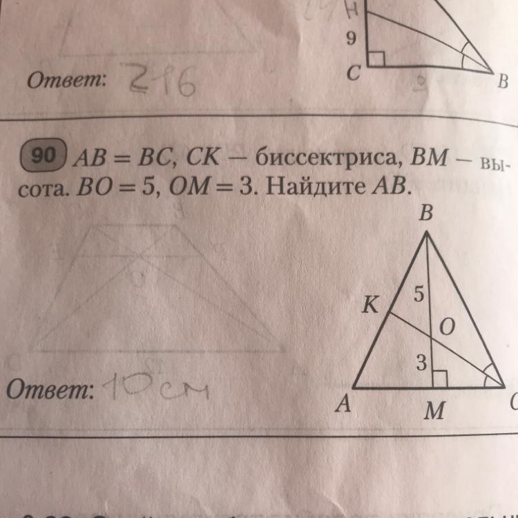 Дан Δ АВС -равнобедренный. В нем проведена биссекриса СК и высота ВМ. Они пересекаются в точке О, так что ВО=5, ОМ =3.