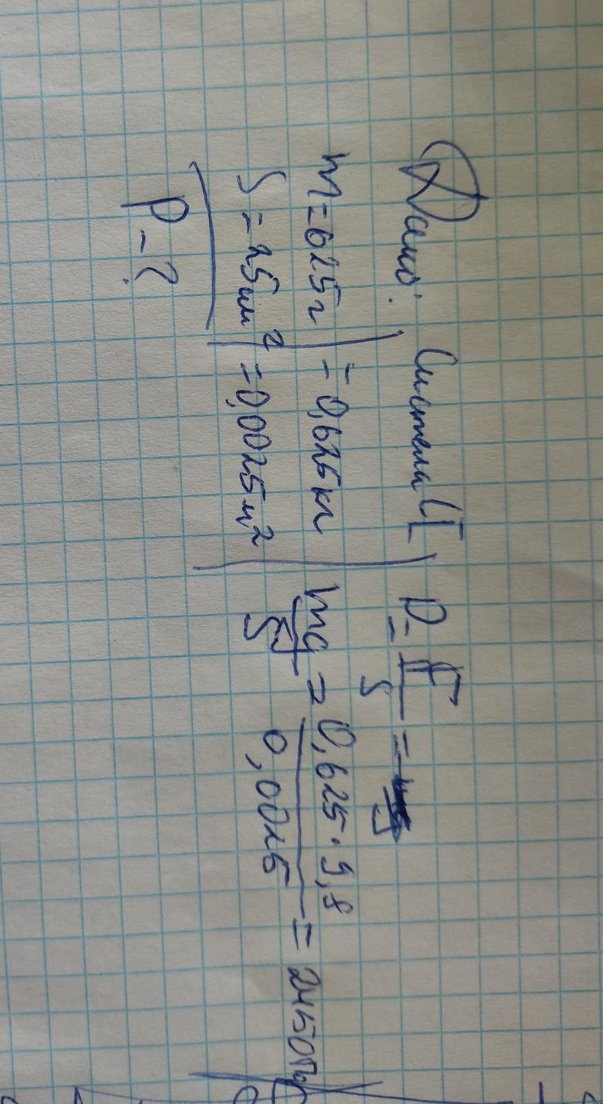 p=mg/S=0,625кг*10м/с^2/0,0025м^2=2500Па
