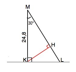 В треугольнике KLM отрезок KM = 24,8 дм , угол М = 30 градусов, угол К = 90 градусов. Найдите: 1)расстояние от точки К до прямой LM; 2)проекцию наклонной LM на прямой KL.
