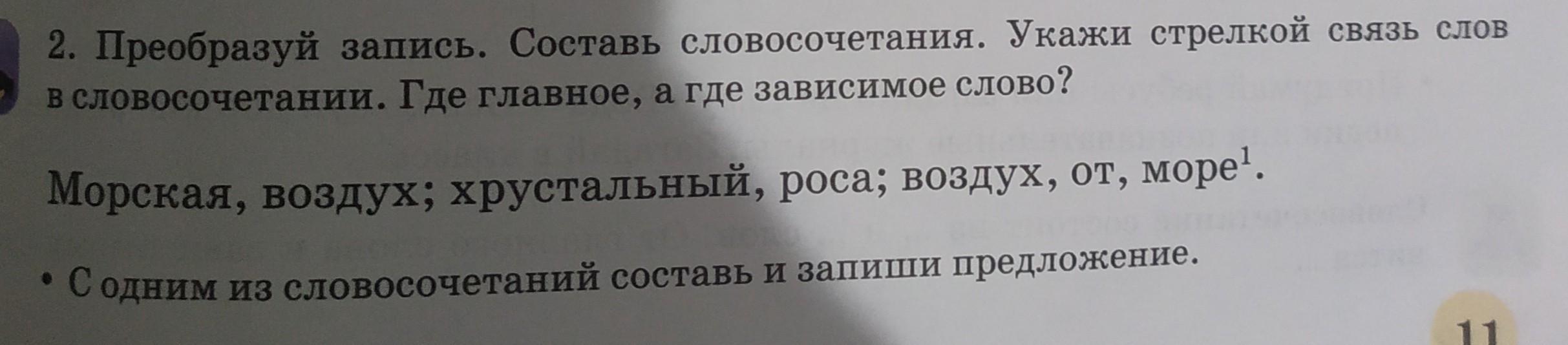 2. Преобразуй запись. Составь словосочетания. Укажи стрелкой связь слов в словосочетании. Где главное, а где зависимое слово? Морская, воздух; хрустальный, роса; воздух, от, море". С одним из словосочетаний составь и запиши предложение.