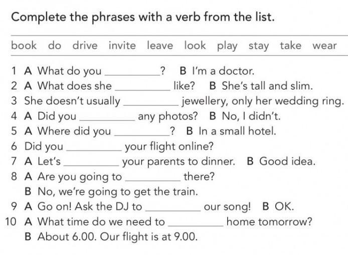 6 Did you 1 A What do you ? B I'm a doctor. 2 A What does she like? B She's tall and slim. 3 She doesn't usually jewellery, only her wedding ring. 4 A Did you any photos? B No, I didn't. 5 A Where did you ? Bin a small hotel. your flight online? 7 A Let's your parents to dinner. B Good idea. 8 A Are you going to there? B No, we're going to get the train. 9 A Go on! Ask the DJ to our song! B OK. 10 A What time do we need to home tomorrow? B About 6.00. Our flight is at 9.00.
