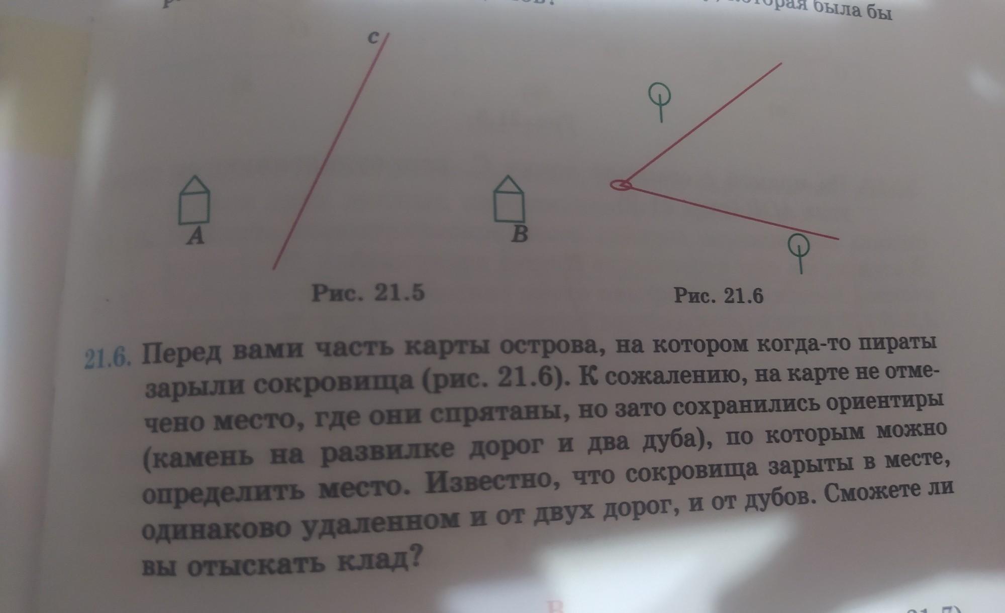 21.6. Перед вами часть карты острова, на котором когда-то пираты зарыли сокровища (рис. 21.6). К сожалению, на карте не отме- чено место, где они спрятаны, но зато сохранились ориентиры (камень на развилке дорог и два дуба), по которым можно определить место. Известно, что сокровища зарыты в месте, одинаково удаленном и от двух дорог, и от дубов. Сможете ли вы отыскать клад?