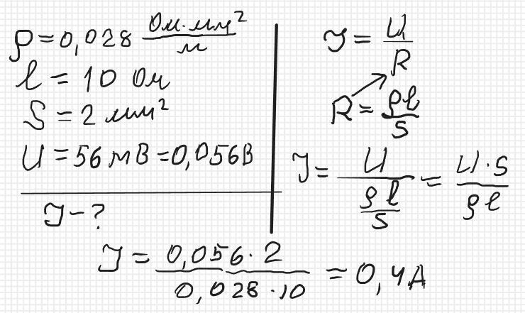Обчисліть силу струму в алюмінієвому дроті, який має довжину 10 м і площу поперечного перерізу 2 мм2: напруга на кінцях дроту становить 56 мВ.