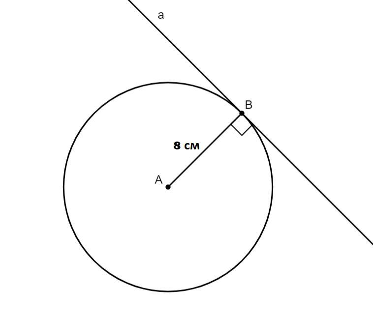 Если расстояние от центра круга до прямой равно радиусу круга (в нашем случае 8 см), то прямая является касательной к кругу, то есть у прямой и круга одна общая точка.