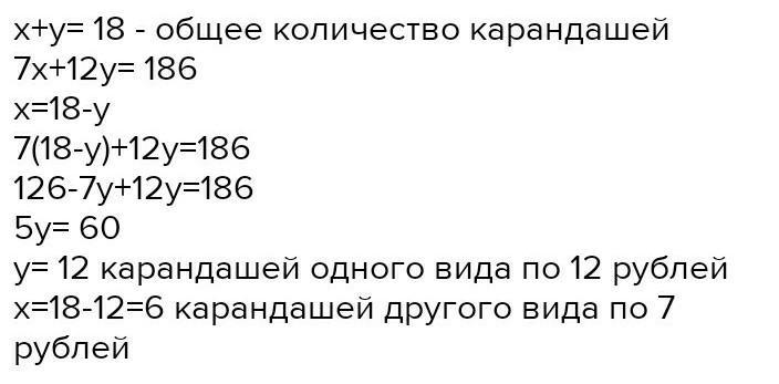Купили 18 карандашей по 7р и по 12р.Заплатив за всю покупку 186р.Сколькт купили карандашей каждого вида?