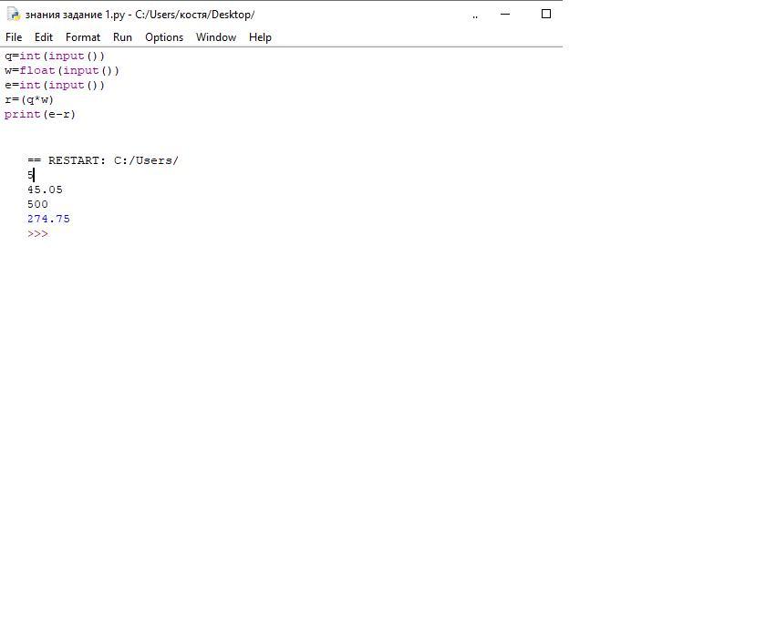 Составьте письменно программу, которая: прочитает с клавиатуры количество килограмм картофеля, приобретаемого в магазине (число целое); прочитает с клавиатуры стоимость одного килограмма картофеля (число дробное); прочитает с клавиатуры сумму, которую покупатель отдает кассиру за приобретаемый картофель; выводит на экран величину полученной сдачи в рублях и копейках. Например, количество приобретаемого картофеля - 5 кг; цена 1 кг картофеля - 45 рублей и 50 копеек (40.5 рублей) сумма, которую покупатель отдает кассиру - 500 руб, тогда сдача- 297 рублей и 50 копеек