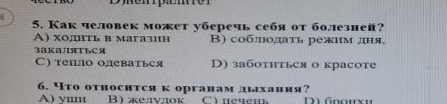 5. Как человек может уберечь себя от болезней? А) ходить в магазин В) соблюдать режим дня, закаляться C) тепло одеваться D) заботиться о красоте