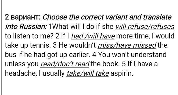 Перевод: 1 Что я буду делать, если она откажется/откажется меня слушать? 2 Если бы у меня было/будет больше времени, я бы занялся теннисом.3 Он бы не опоздал/опоздал на автобус, если бы встал раньше. 4 Вы не поймете, пока не прочитаете/не прочитаете книгу. 5 Если у меня болит голова, я обычно принимаю/буду принимать аспирин.