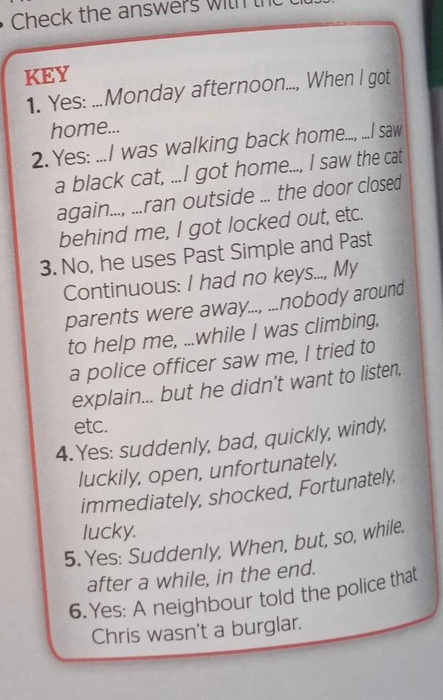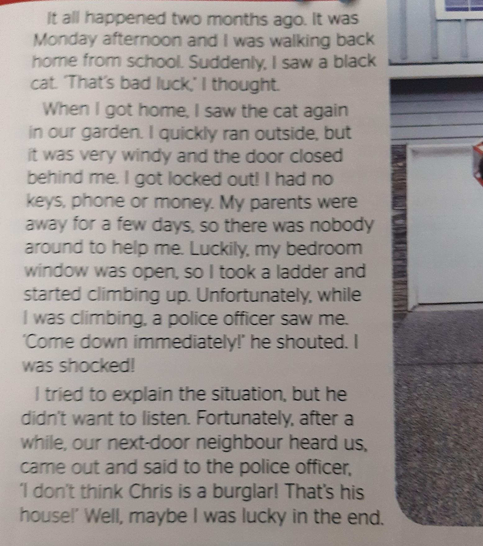 1. Does the writer say when and where the story happened? 2. Does the writer mention the events of the story in the order in which they happened? 3. Does the writer use present tenses to describe what happened? 4. Does the writer use adjectives and adverbs? 5. Does the writer use linking words? 6. Does the writer say what finally happened? помогите пж