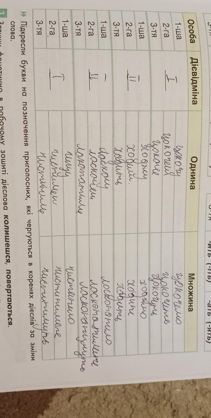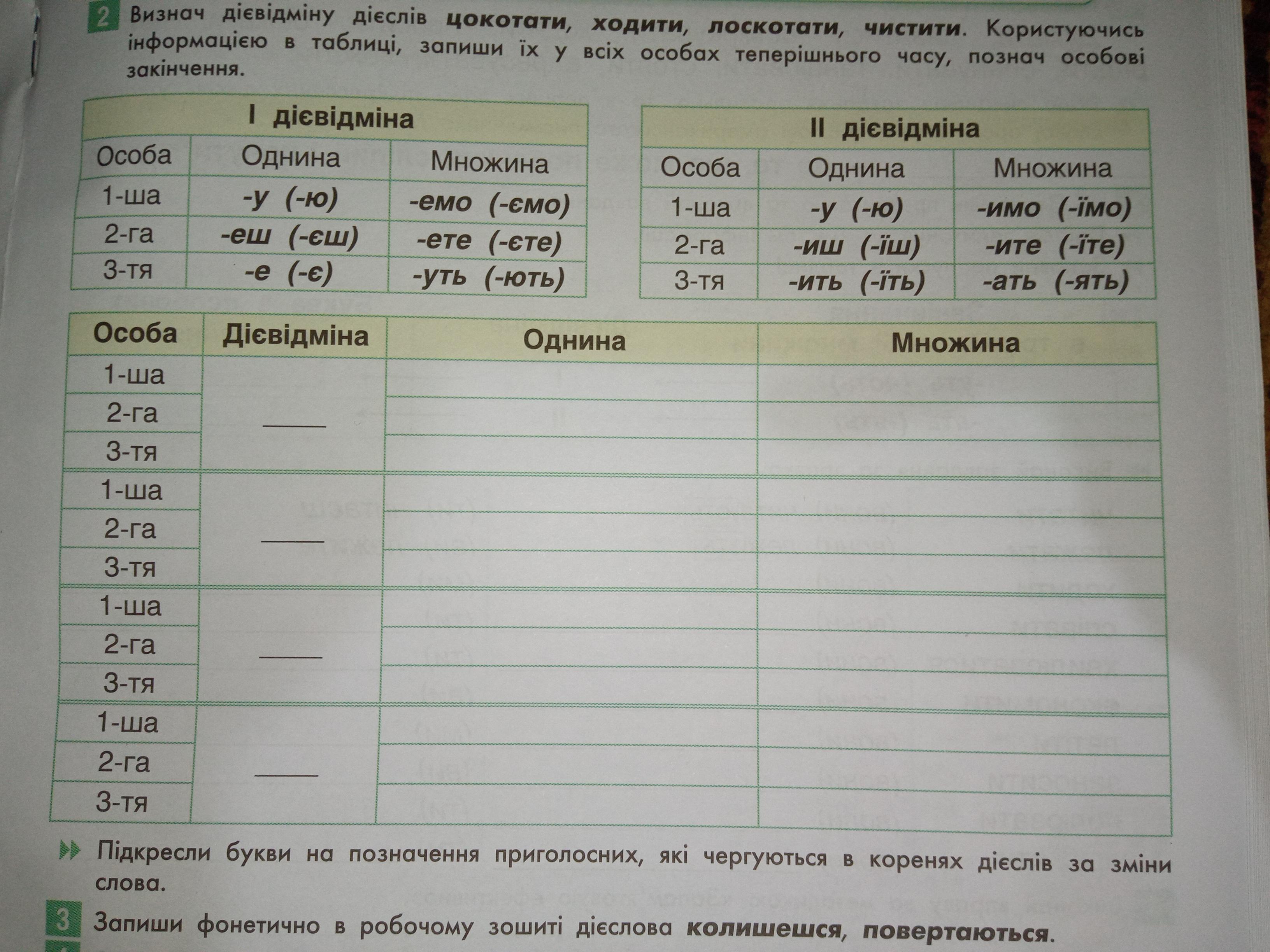 Визначте дієвідміну дієслів цокотати, ходити, лоскотати, чистити користуючись інформацію в таблиці, запиши їх у всіх особах теперішнього часу позначте особові закінчення.