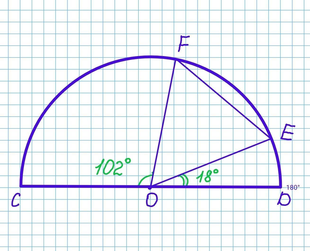 Центральный ∠FOE=∠COD-∠COF-∠DOE=180°-102°-18°=60°.