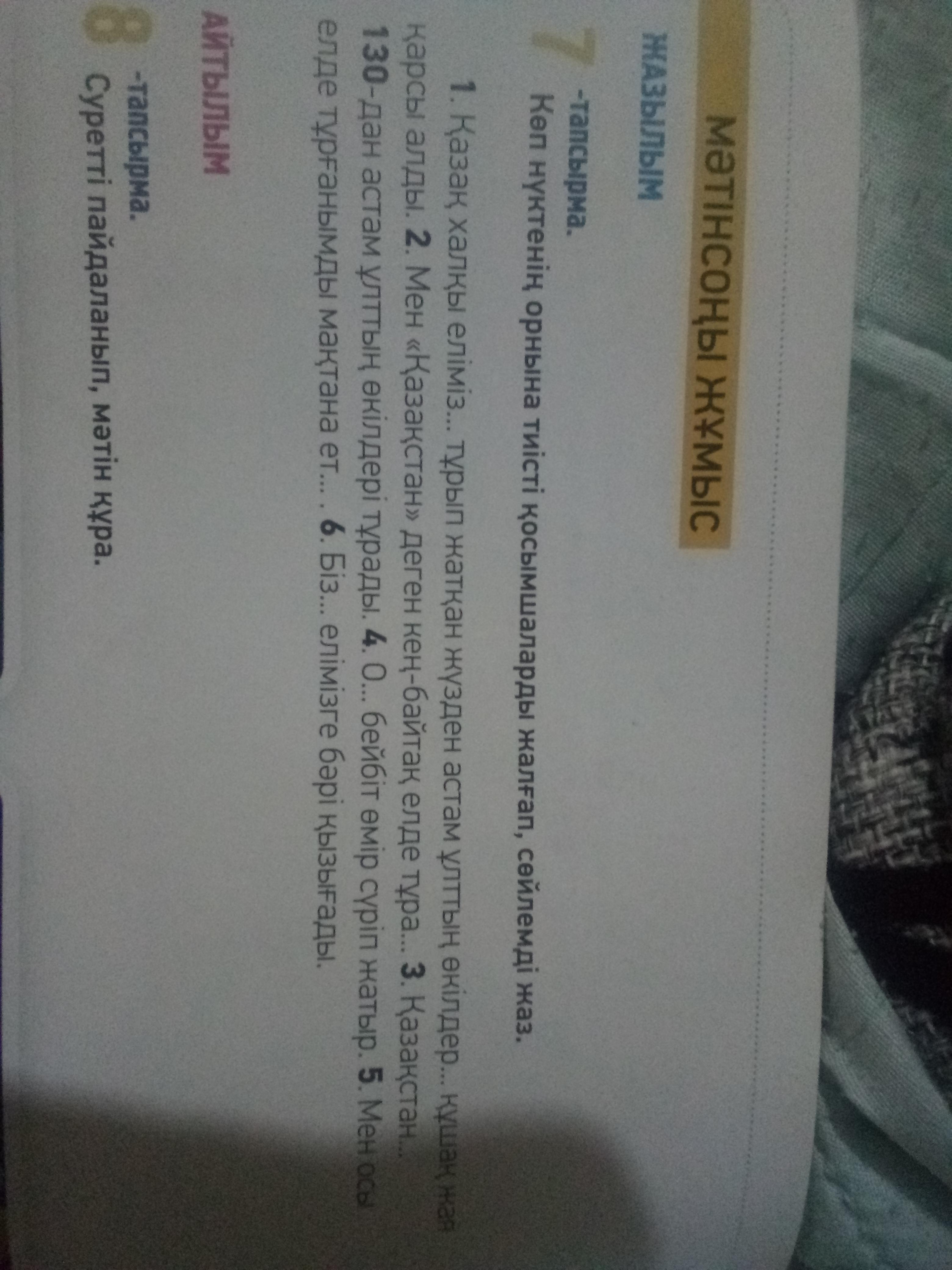 Ответ: елелімізде , өкілдерің,тұрамын,Казақстанда,олар,етемін, біздің.