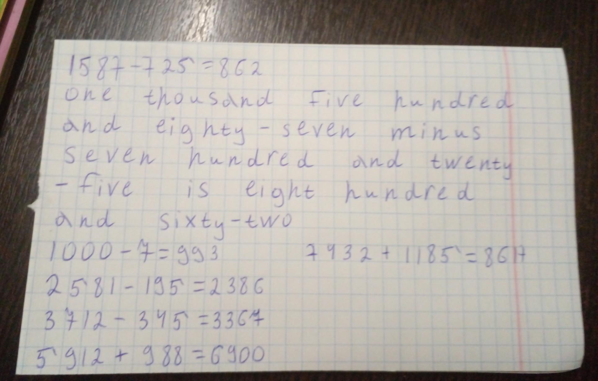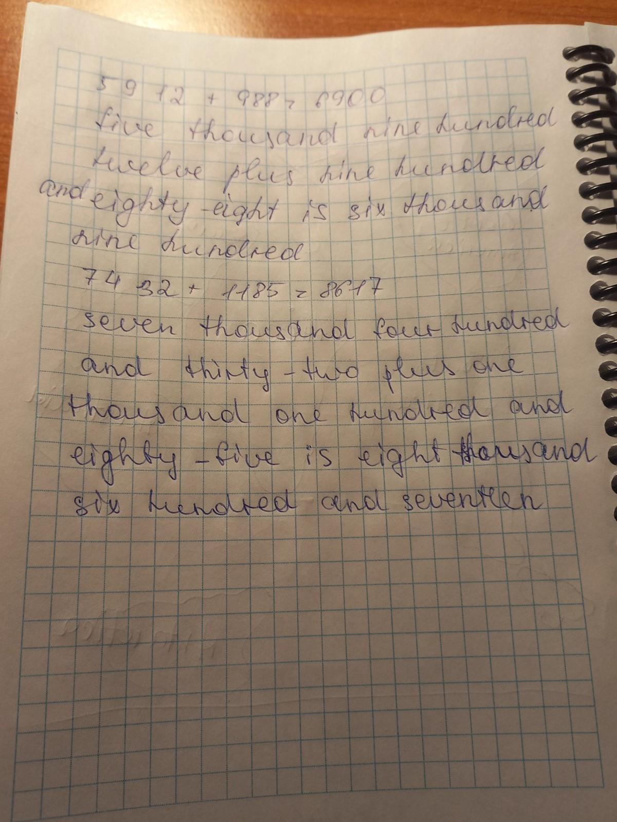 5.seven thousand four hundred and thirty-two plus one thousand one hundred and eighty-five is eight thousand six hundred and seventeen