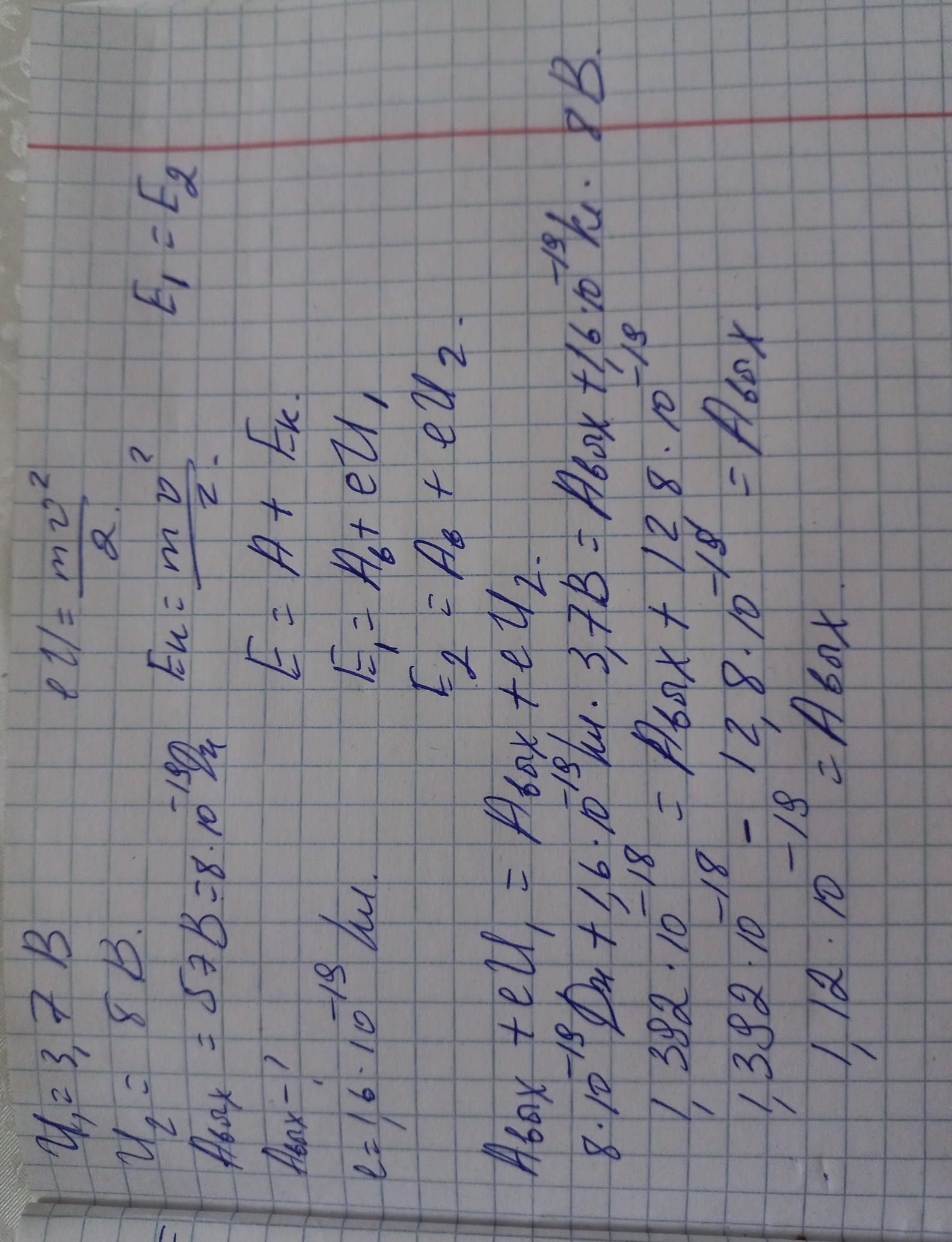 При облучении ультрафиолетовыми лучами пластинки из никеля запирающее напряжение оказалось равным 3,7 В. При замене пластинки из никеля пластиной из другого металла запирающее напряжение потребовалось увеличить до 8 В. Определите работу выхода электрона с поверхности этой пластинки. Работа выхода электронов из никеля равна 5э В.